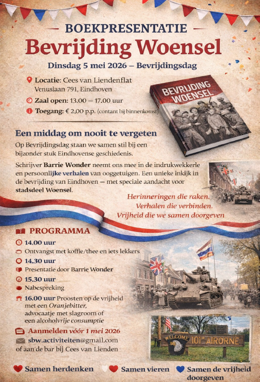 Lees voor Boekpresentatie Bevrijding Boekpresentatatie “Bevrijding Woensel” dinsdag 5 mei 2026 (Aanmelden vóór 1 mei 2026 ) sbw.activiteiten@gmail.com
